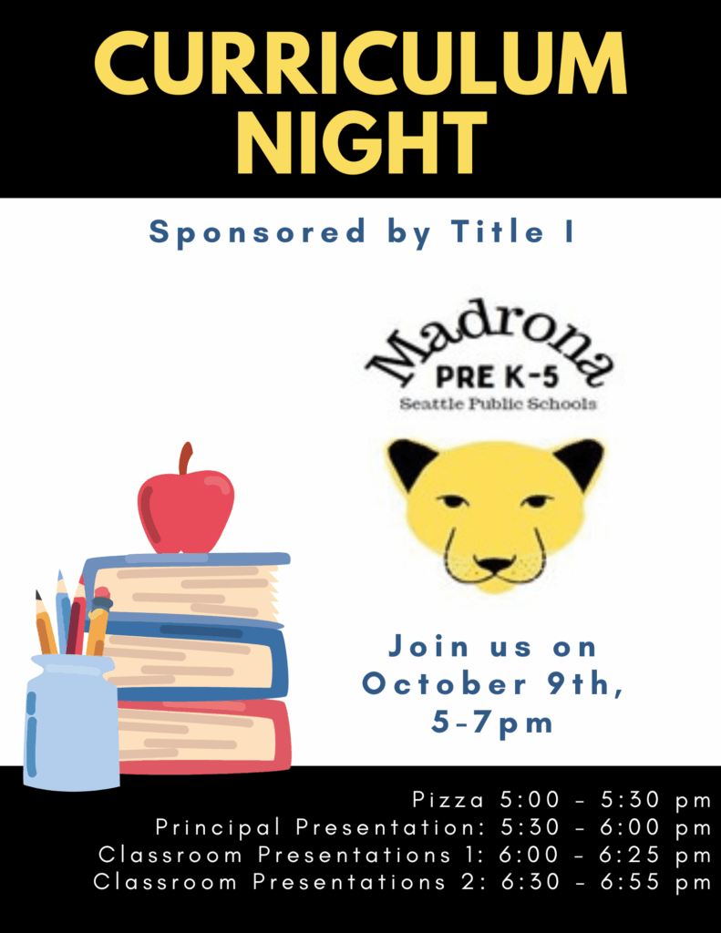 Summary : Please join us on October 9, 5:00PM-7:00PM for Curriculum Night. Meet your student\'s teachers and the staff at Madrona.