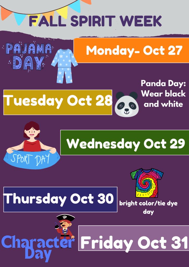 Spirit Week Posted on: October 13, 2025 Summary : Spirit week is coming up at the end of October. Check out the fun themes and dress up each day.